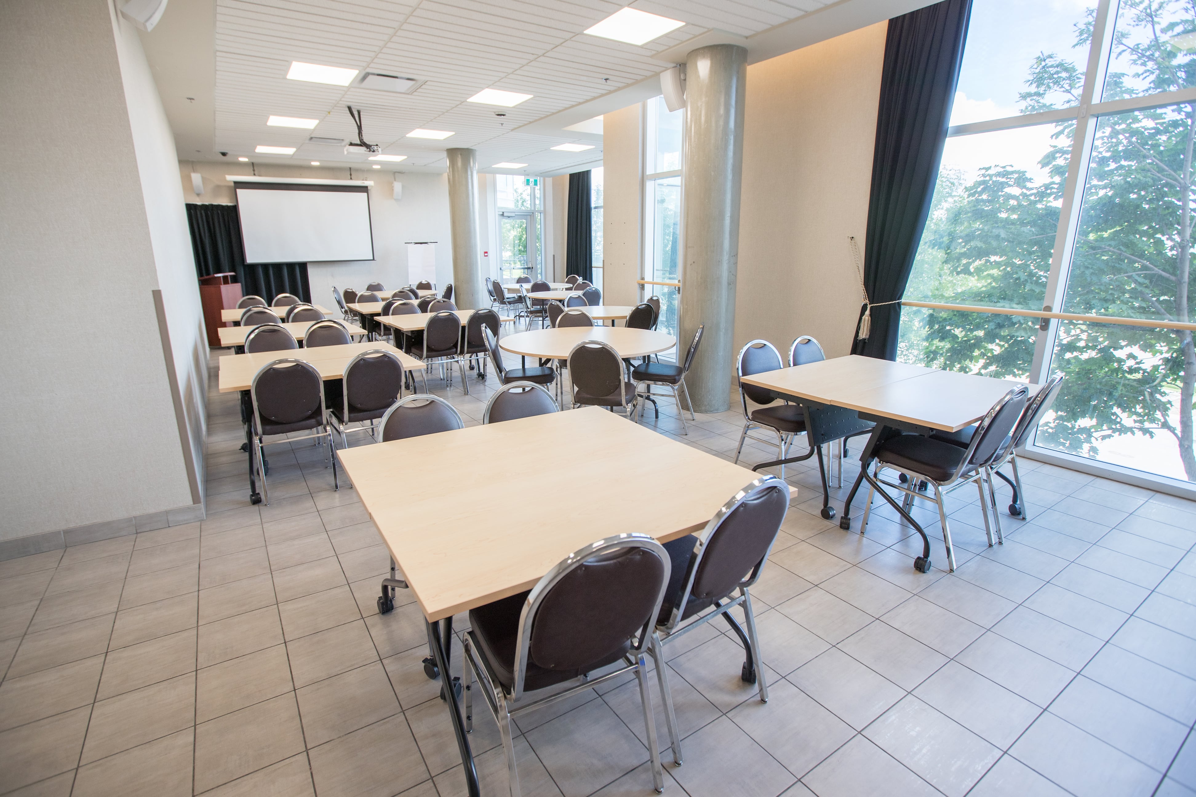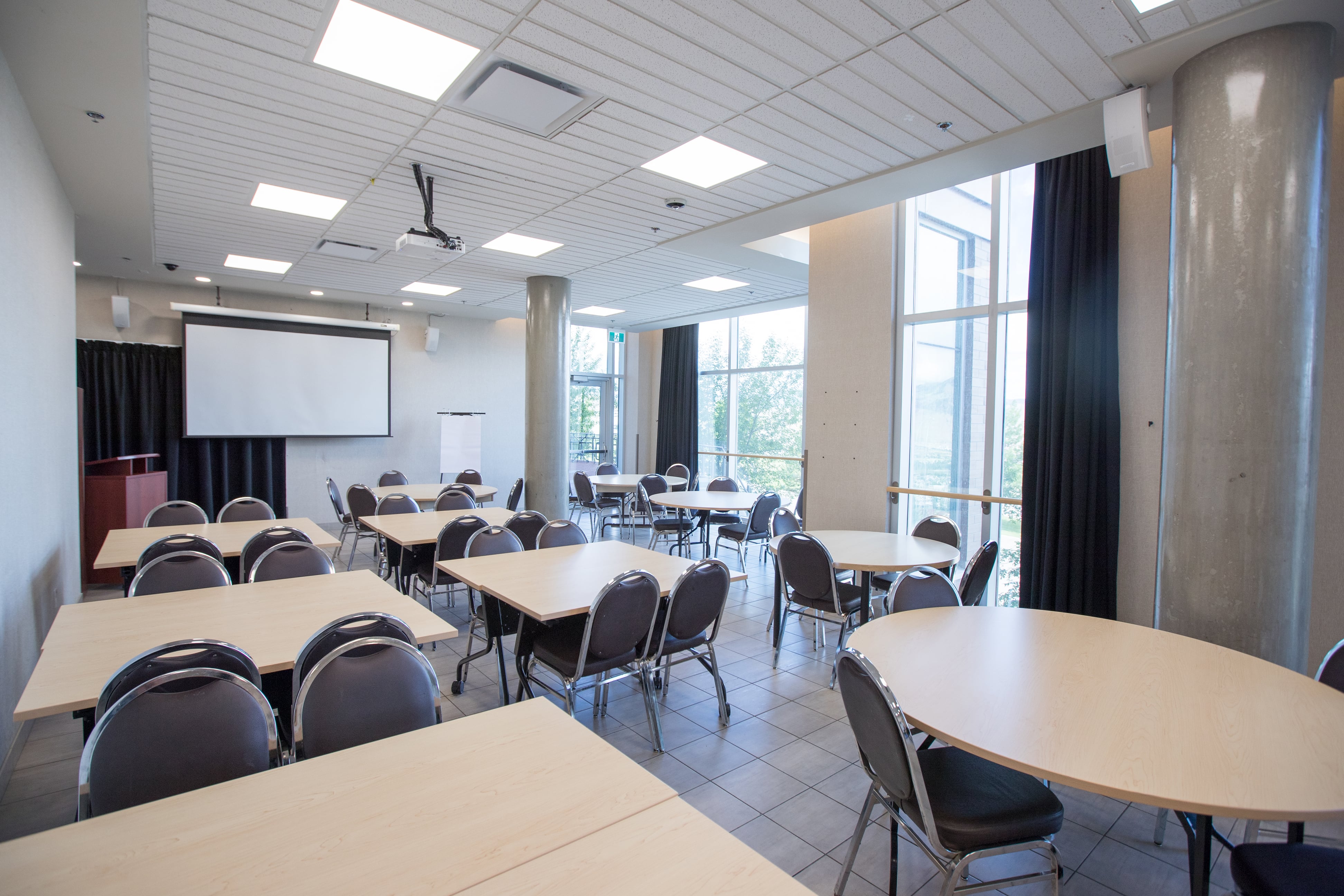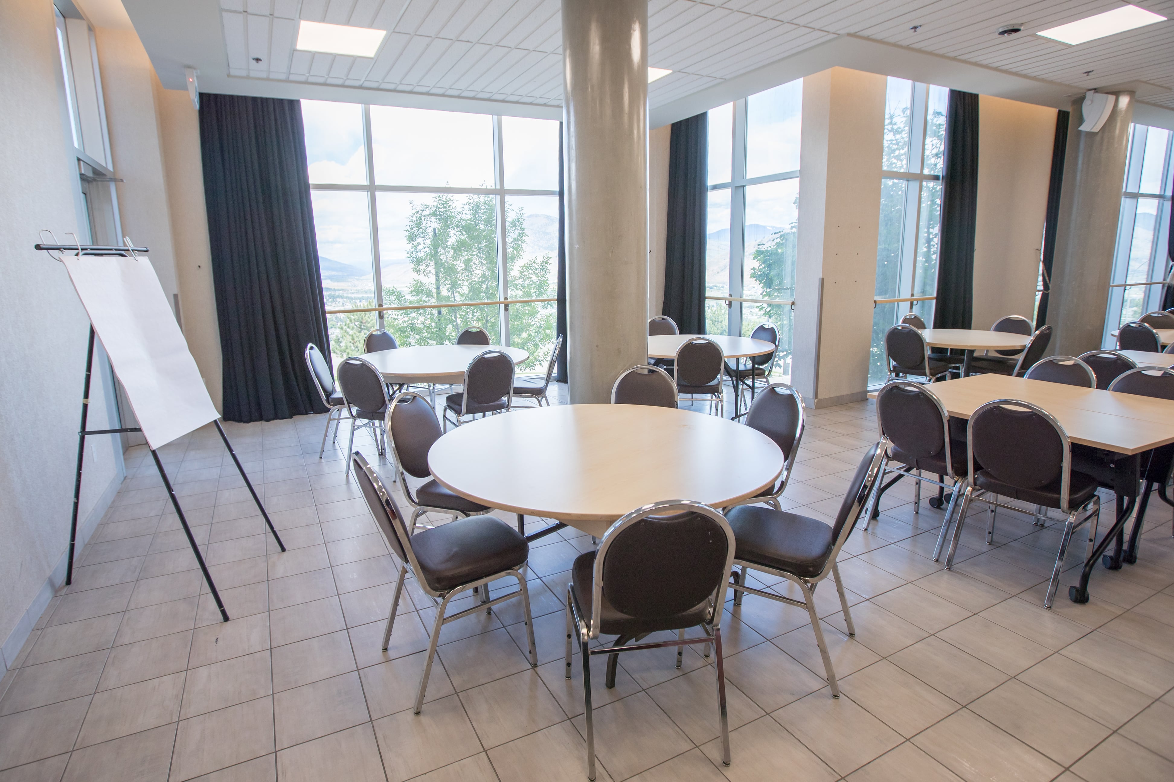 Located on the first floor of the Residence & Conference Centre, this versatile venue features floor‑to‑ceiling windows that fill the room with natural light and offer impressive city views. Guests can also step outside onto the spacious brick patio—a perfect spot to enjoy the Kamloops sunshine during breaks. Ideal for meetings, social gatherings, sports groups, and interactive workshops.