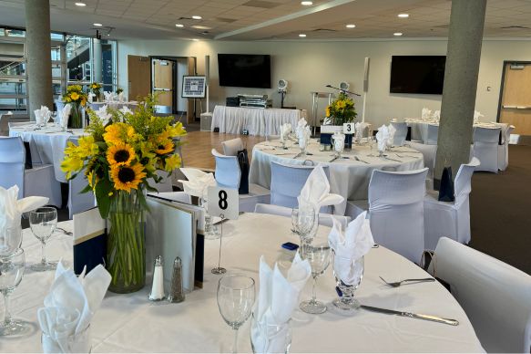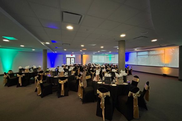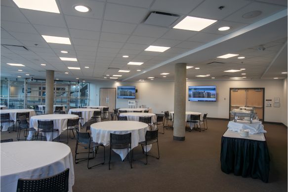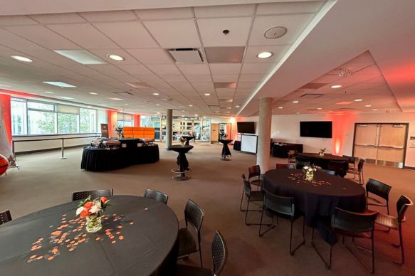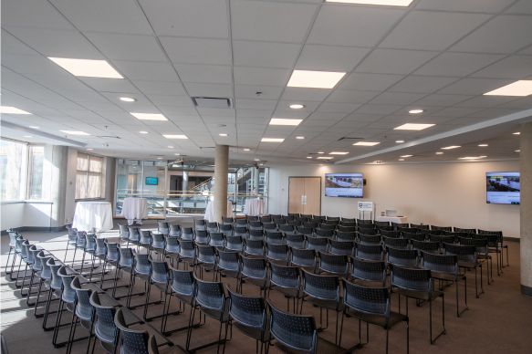This beautifully modernized space features flexible lighting options, an enhanced sound system, and dual 80” LCD screens—creating a professional, polished setting for any event. A versatile garage‑style door opens into the Rotunda, offering a seamless indoor‑to‑indoor flow that elevates guest experience. Wall‑to‑wall windows fill the room with natural light and showcase scenic views of the TRU Campus Commons. Ideal for social gatherings, intimate conferences, presentations, meetings, and weddings, this venue adapts effortlessly to meet your event needs.