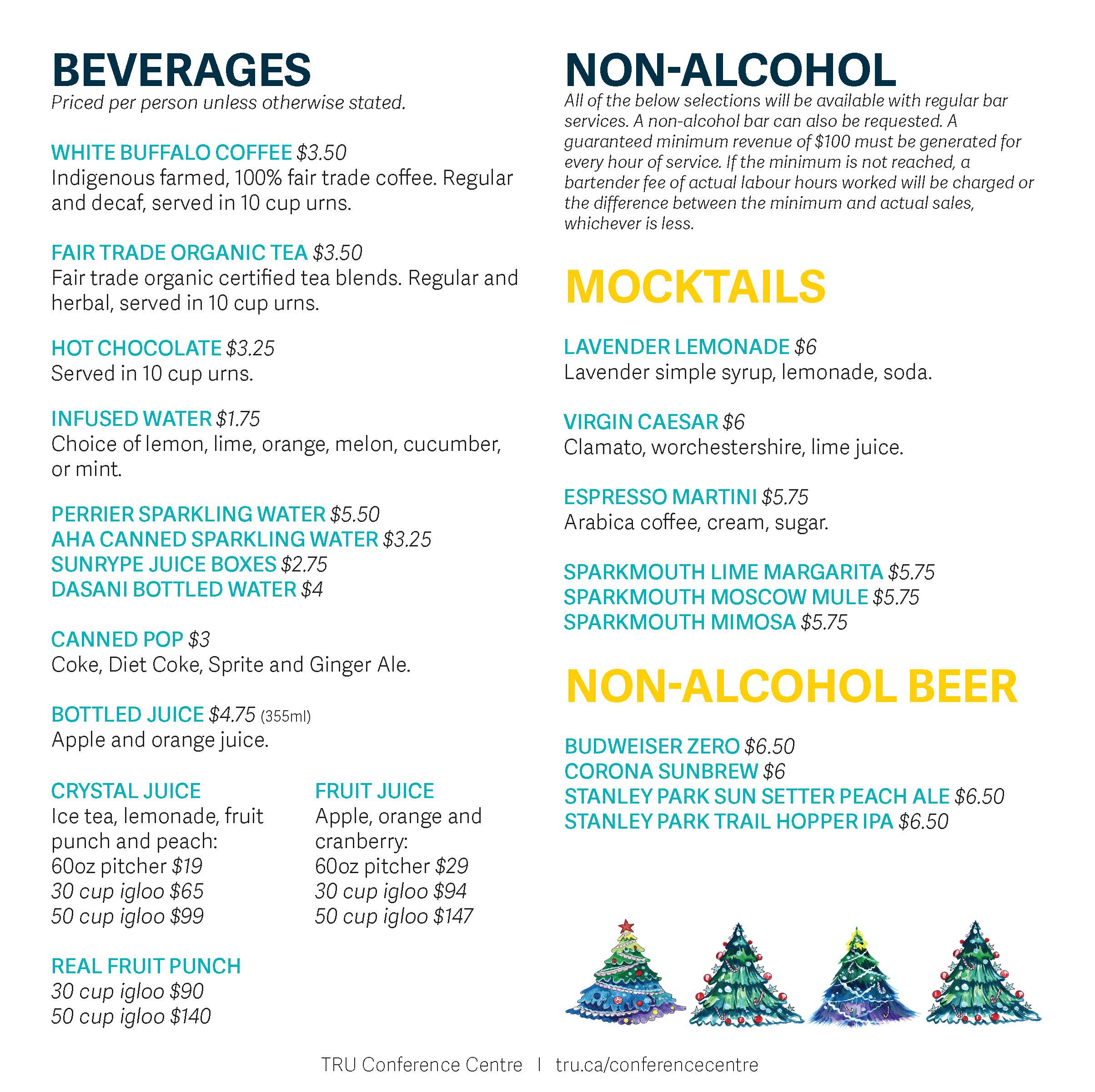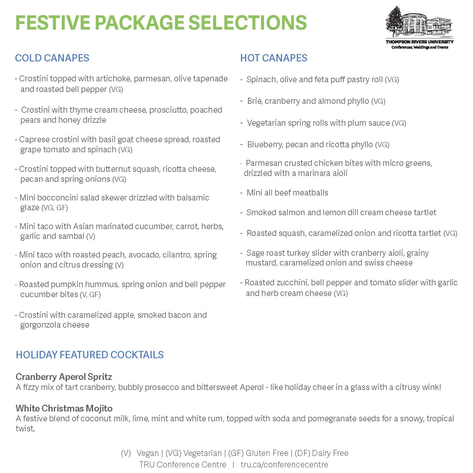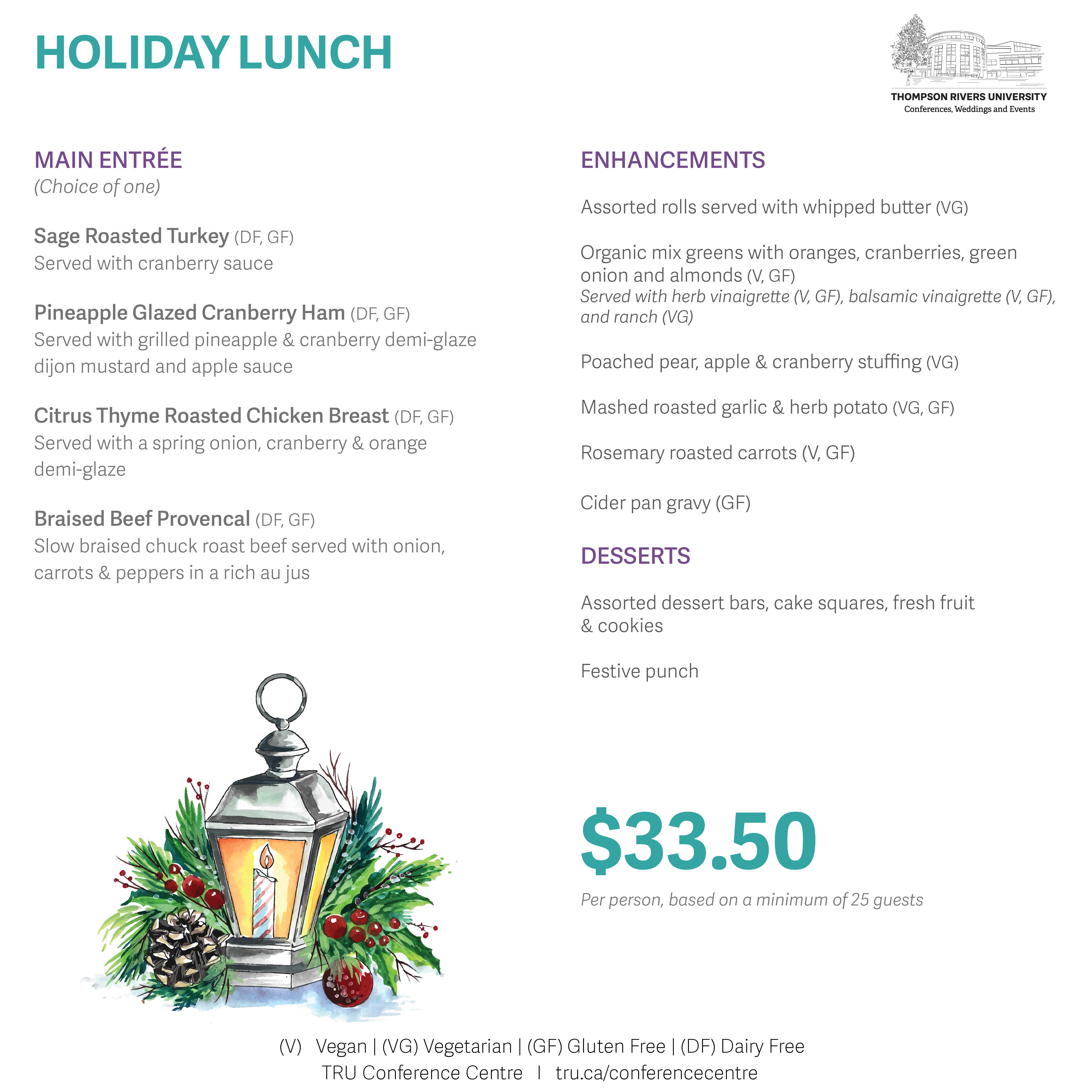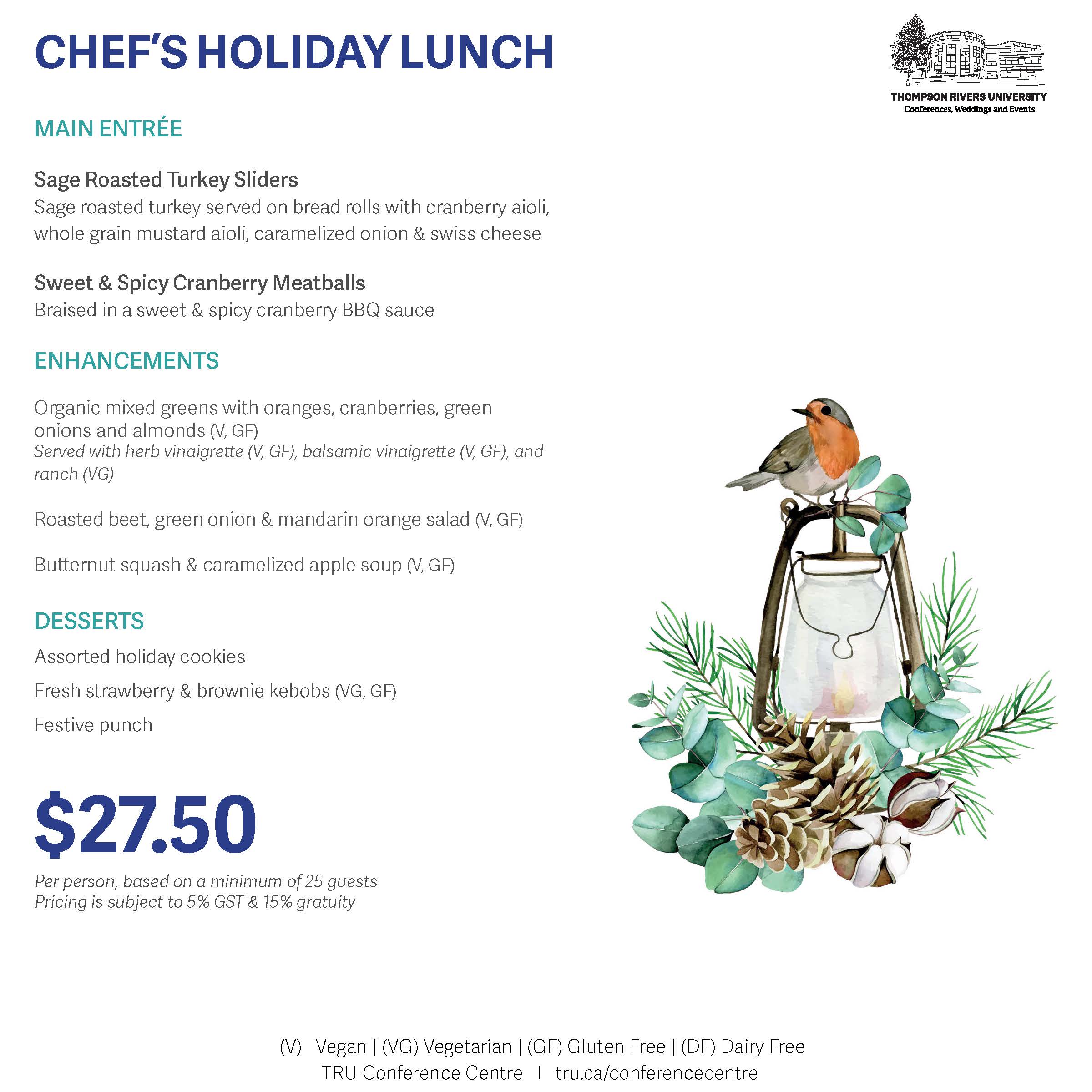 Celebrate the holidays with your staff, friends or family at the TRU Conference Centre. We offer a number of venue spaces with varying capacity, all of which will be festively decorated. The most popular Holiday rooms are the Grand Hall, Mountain Room, Terrace Room or The Den
