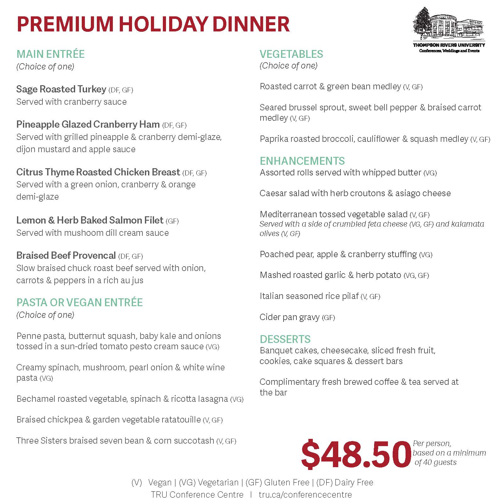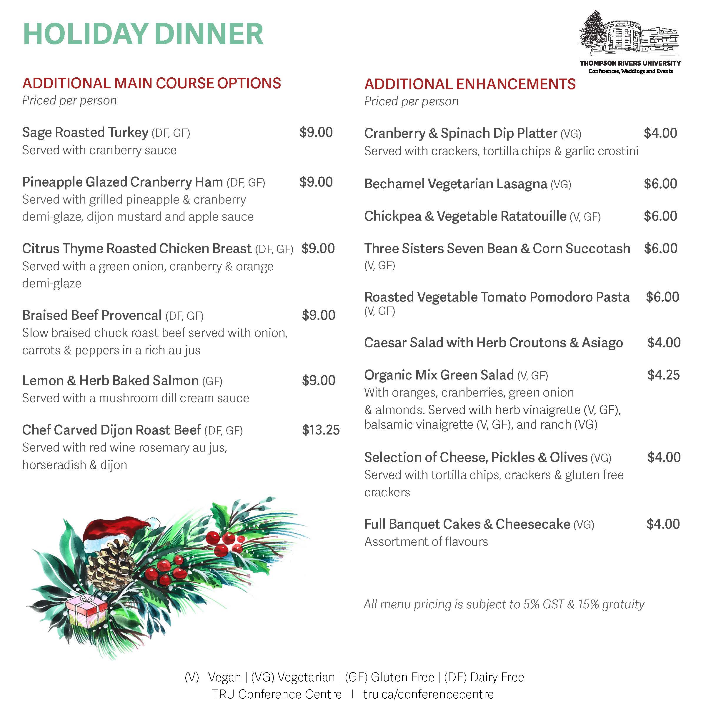 The 2025 Holiday dinner options have arrived, providing two options at different price points to meet your event needs. Both options involve some selections to help customize the menu to your needs with the premium option providing the most amount of customization. View the Holiday Dinner additions page for ways to add to the dinner option.
